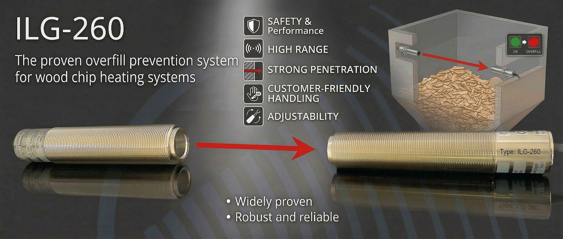 This new photoelectric sensor is used as an overfill protection in wood chip heating systems and has already proven itself many times over. Due to its high range, coupled with its very strong penetration (be it white steam, dark black smoke or even by fire) and due to its customer-friendly handling (plug&play) and alignability, the high performance light barrier ILG-260 offers a maximum of performance, safety and reliability.